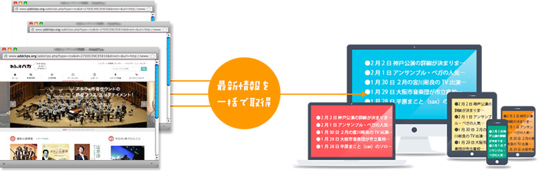 日ごろ良く見ているお気に入りの日記やブログ、ニュースサイトをRSSに登録(購読)すると、最新情報を自動で収集して手元に届けてくれるので、ホームページからの情報収集はとても効率的なものになります。