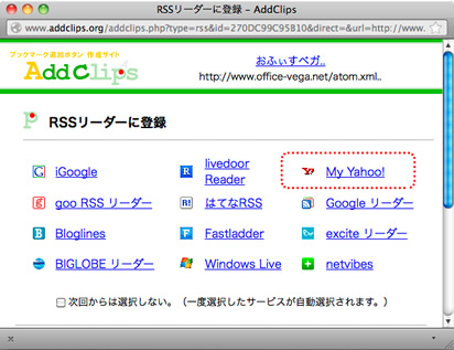 上記の図例では、「MyYahoo!」に登録して(↑)「おふぃすベガ」のRSSを購読するところです。